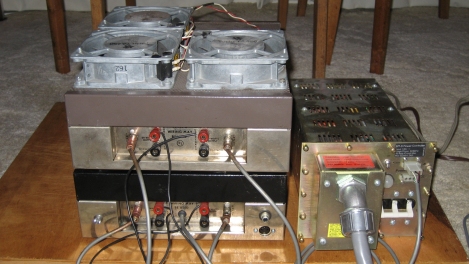 The modified Dyna 120 power amplifier sits on top with the added fans. Interconnetion between