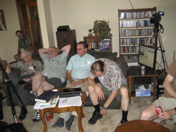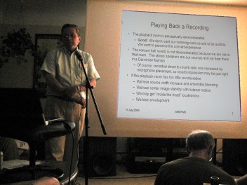 The formal meeting. Dave Hill, Dennis Green, Arny Krueger, David Clark, and Bern Muller. The video camera and computer stream the meeting to Gary Eichmeier in Florida. | David Clark presents "de-reverberation", the way the ear accomodates the acoustics of a room. |