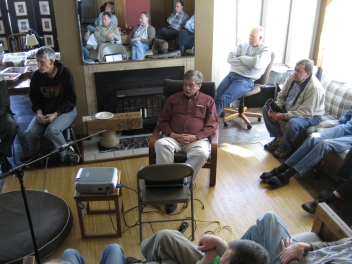 Left to right, including the mirror, Ron Burk, Bob Klacza, John Budrys, Bern Muller, Barry Cogley, Kurt Lyons, Tom Nousaine, and Dave Hill surround David Clark, his projector and the microphone that worked, but was not getting to the web.