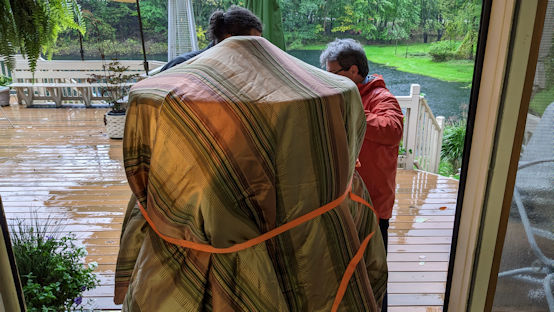 In the rain James and Mark begin the trip to their trailer with DUMAX under a tarp. |